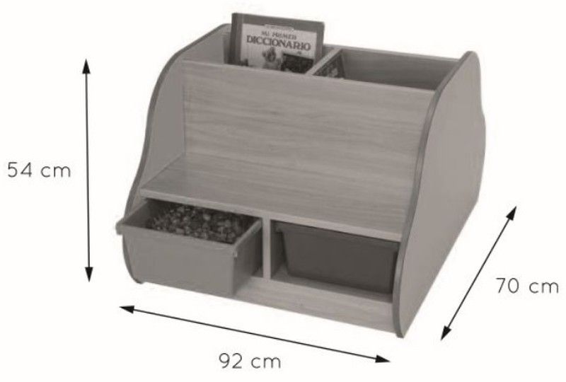 Banc de dues cares amb 2 places a cadascuna i zona central entre respatllers per a l'exposició de llibres. Amb 4 cubetes (2 a cada costat) sota el seient perquè els nens puguin guardar els jocs. Fabricat amb melamina de faig, amb taulers de 19 mm de gruix i cantells de PVC de 2 mm, acabat per les dues cares. Lats decoratius de DM melaminitzat de 16 mm de gruix amb cantells arrodonits i envernissats amb vernís no tòxic. Garantit pels assaigs realitzats al centre tecnològic de certificació de mobiliari TECNALIA.