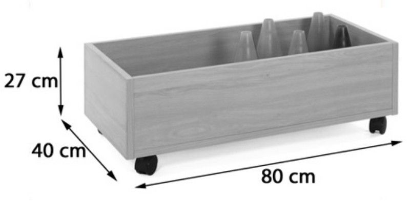 Moble demmagatzematge. Fabricat amb melamina de faig, amb taulers de 19 mm de gruix i cantells de PVC de 2 mm, acabat per les dues cares. Rodes de 6 cm amb fre, per evitar la humitat i poder-lo desplaçar fàcilment. Garantit pels assaigs realitzats al centre tecnològic de certificació de mobiliari TECNALIA.