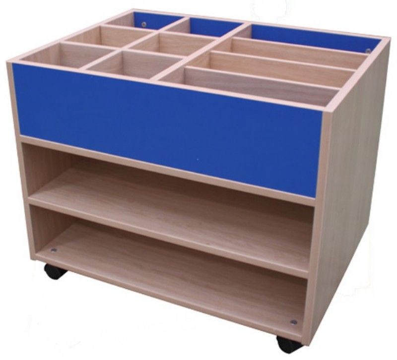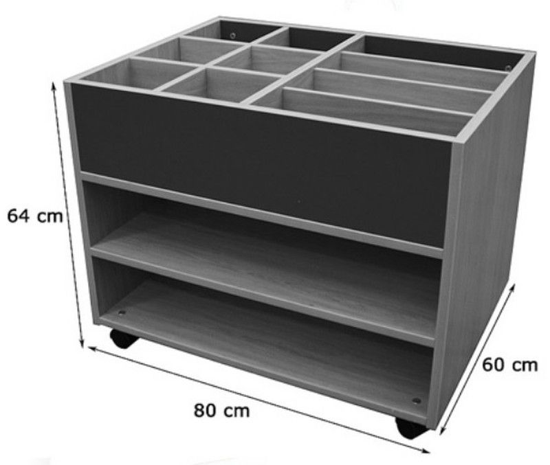 Moble llibreria compost de 6 caselles més 4 espais demmagatzematge, accessibles des de la part superior i part baixa, accessible per les dues cares, amb diferents espais. Fabricat amb melamina de faig, amb taulers de 19 mm de gruix; separadors de 16 mm i cantells de PVC de 2 mm, acabat per les dues cares. Rodes de 6 cm amb fre, per evitar la humitat i poder-lo desplaçar fàcilment. Garantit pels assaigs realitzats al centre tecnològic de certificació de mobiliari TECNALIA.