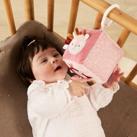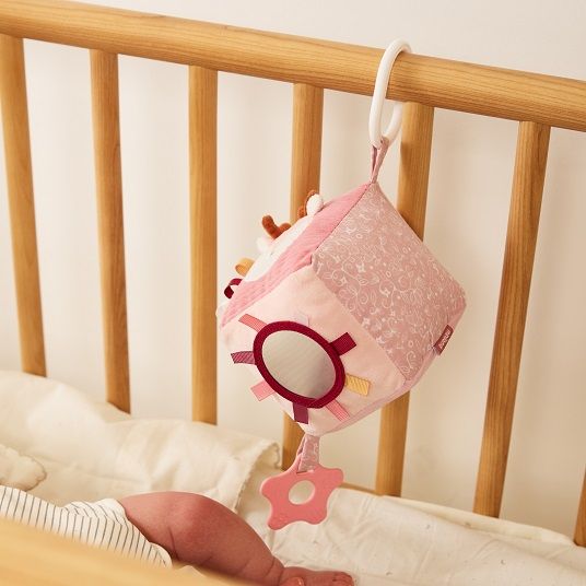 Un cub sensorial per explorar penjat de qualsevol lloc. Aquesta joguina penjant en forma de cub és perfecte per estimular els sentits del nadó des del naixement. Amb textures, mirall, mossegador i sonall integrats, converteix el bressol o el carret en un petit centre de descoberta i joc.
