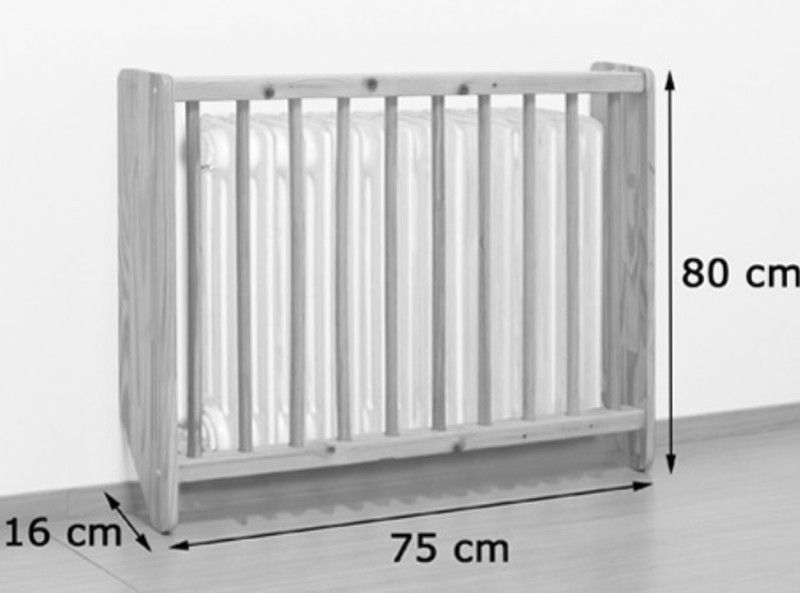 Cobreix radiador fabricat en fusta de pi massís, envernissat al natural, amb barrots rodons. La part baixa dels costats està tallada a 45º per salvar sòcols. Els cantons són arrodonits per a més seguretat. Les separacions entre barrots compleixen les normatives de seguretat. Garantit pels assaigs realitzats al centre tecnològic de certificació de mobiliari TECNALIA.