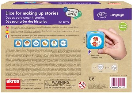 Llança els daus i deixa volar la teva imaginació. Crea diferents històries amb els personatges, animals, objectes i accions que apareixen en els daus.