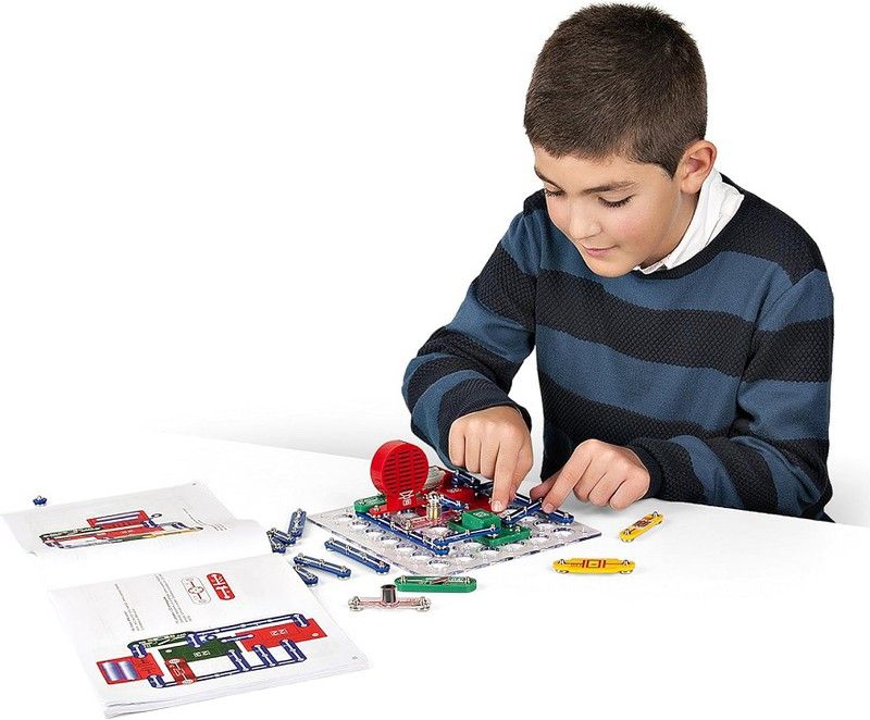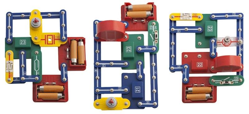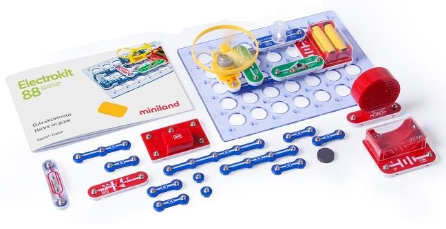 Primers passos al món de l'electrònica. Els portapiles, motors, altaveus, hèlixs, interruptors, portabombetes amb bombetes, imants, etc, es connecten sense eines per crear els 88 muntatges que apareixen al manual. Necessita piles (no incloses)