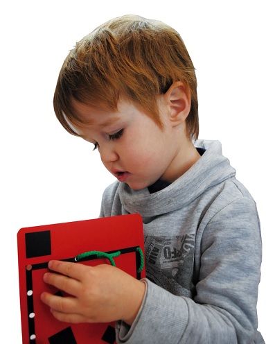 Targetes i cordons de plàstic en colors vius per filar i traçar. Aprenentatge actiu en la distinció dun triangle, un cercle o un quadrat. Les formes impreses són per parlar de mides.