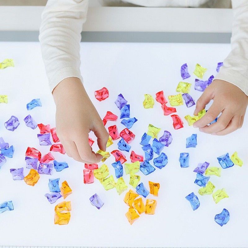 Gemmes de diferents colors, realitzades en plàstic translúcid per utilitzar-les com a comptadors i jugar a classificar-les per colors. Aquest recurs educatiu és apte per a taules de llum.