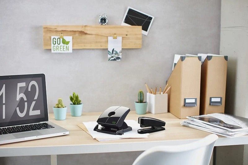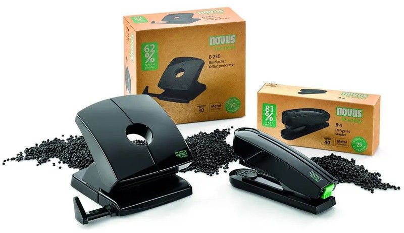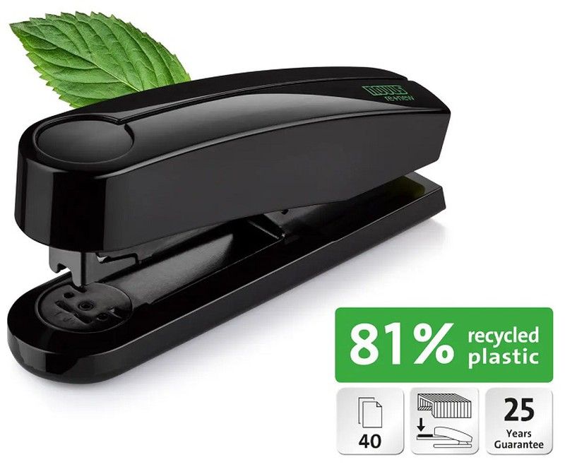 Grapadora d'oficina sostenible per a ús professional diari - Mecanisme de metall amb revestiment de plàstic brillant reciclat - Carregador d'obertura frontal i doble guia per a grapes - Patidora rotativa que permet tres tipus de grapat: obert o temporal, tancat o permanent i clavat - Pes aprox. 245 g - Inclou 200 grapes de tipus 24/6 DIN Super