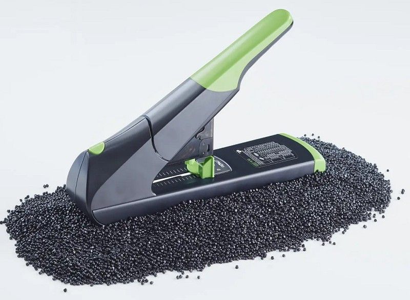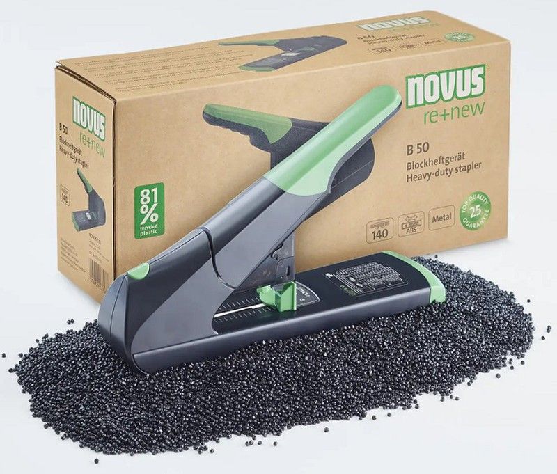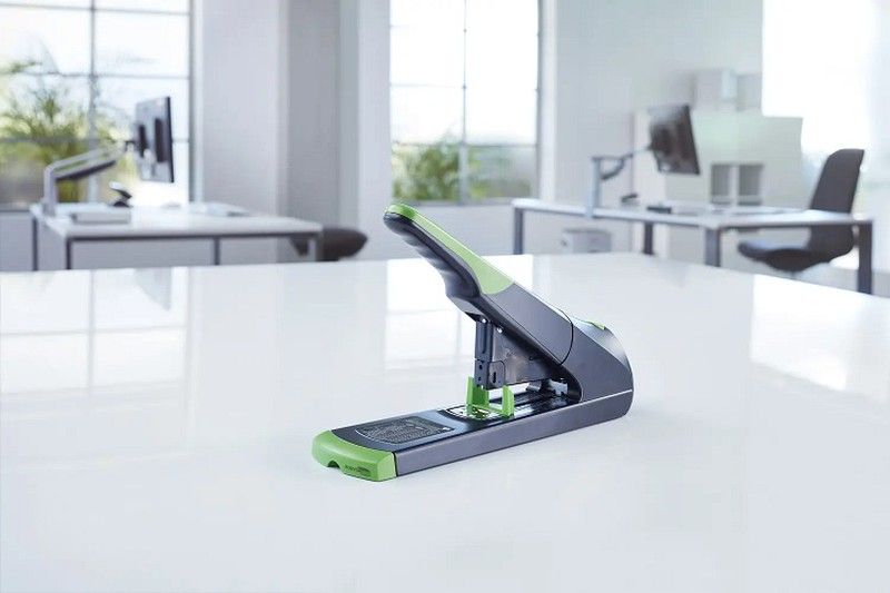 Grapadora de gruixos sostenible, per a qualsevol tasca de gran envergadura de fins a 140 fulls - Sistema antibloqueig (ABS) per evitar embussos - Cos de metall amb revestiment de plàstic reciclat sostenible - La profunditat d'entrada del paper es pot variar (fins a 75 mm) - Solució de fallades exprés per a un grapat en buit en cas necessari - Carregador d'obertura frontal amb doble guia muntada sobre un ressort per evitar embussos de grapes - Patidora rotativa per facilitar un ràpid canvi entre el grapat en paral·lel i el bypass - Pes aprox. 1460 g