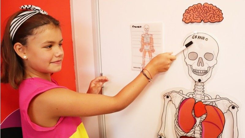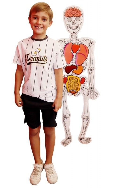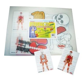 Un gran esquelet articulat i anatòmicament correcte per armar i col·locar a la paret. Imprescindible per a l'aprenentatge del cos humà, els noms i la col·locació dels ossos a més el funcionament dels 10 òrgans més importants. Tot en plàstic flexible i rentables amb superfície apte per a escriptura amb retolador de neteja en sec. Presentació a borsa.