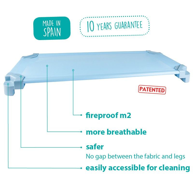 El llit més segur del mercat, fabricat a Espanya d'acord amb la Normativa Europea de Seguretat. La seva gran estabilitat evita accidents: no s'aboca. La tela és ignífuga M2 i no es destensa amb l'ús. La robustesa de les potes evita accidents en no deixar buits entre teixit i potes, i permet la seva fàcil higiene. (131x55x11cm).