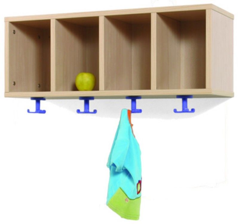Caseller amb 4 caselles, fabricat en melamina de faig amb taulers de 19 mm de gruix, excepte del darrere de 10 mm; separadors de caselles de 19 mm. Cants de PVC de 2 mm, acabat per les dues cares. Disposa de 4 penjadors giratoris fabricats en polipropilè amb arestes arrodonides i sistema triple penjador, per penjar la vestimenta del nen. Garantit pels assaigs realitzats al centre tecnològic de certificació de mobiliari TECNALIA.
