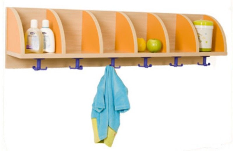 Caseller amb 6 caselles de separacions arrodonides, fabricat en melamina de faig amb taulers de 19 mm de gruix, i posterior de 19 mm per obtenir més rigidesa, estabilitat i subjecció. Cants de PVC de 2 mm, acabat per les dues cares. Disposa de 6 penjadors giratoris fabricats en polipropilè amb arestes arrodonides i sistema triple penjador, per penjar la vestimenta del nen. Garantit pels assaigs realitzats al centre tecnològic de certificació de mobiliari TECNALIA.