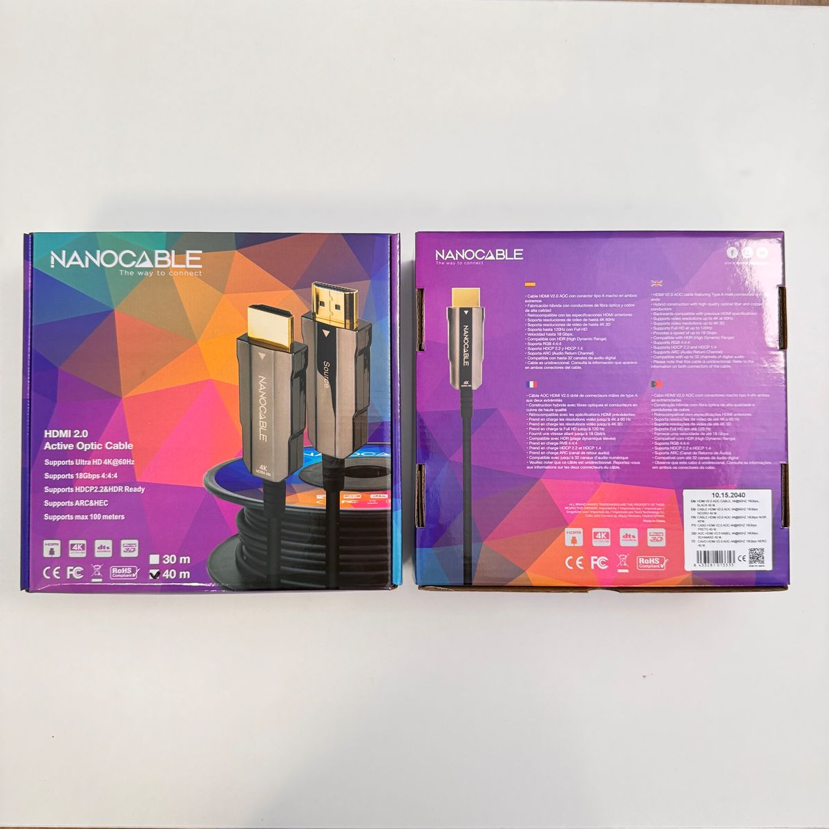 CABLE HDMI V2.0 AOC 4K@60HZ 18GBPSGràcies a una construcció premium, la millor qualitat de materials i, per descomptat, lús de fibra òptica, els nostres cables et permetran obtenir una alta velocitat de transmissió de dades. No perdràs gens ni mica de qualitat ni tan sols en les distàncies més llargues. Arriba a una amplada de banda de 18Gbps i una resolució de vídeo de 60 Hz en 4K. Els nostres cables es presenten en les nostres característiques bobines en les mesures de 30 a 100 metres.Cable unidireccional, ha de ser instal·lat. Mira la informació que apareix als dos connectors del cable per no tenir dubtes! Nanocable Cable HDMI V2.0 AOC 4K@60Hz 18Gbps A/M-A/M, Negre, 40 m, 40 m, HDMI tipus A (Estàndard), HDMI tipus A (Estàndard), 3D, 18 Gbit/s, Negre