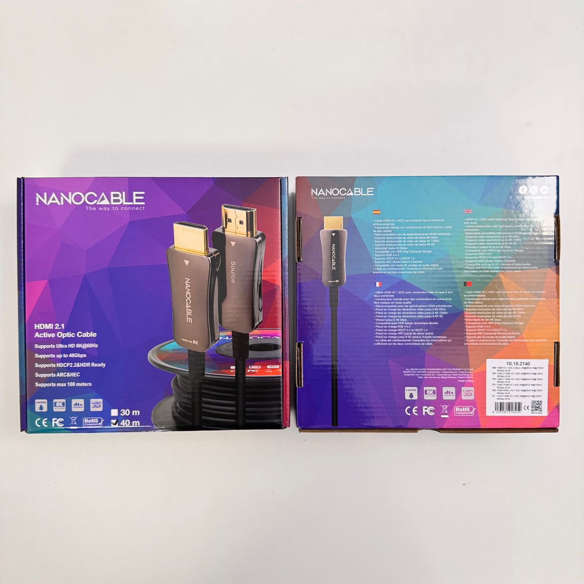 CABLE HDMI V2.1 AOC 8K@60HZ 4K@120HZ 48GBPSGràcies a una construcció premium, la millor qualitat de materials i, per descomptat, lús de fibra òptica, els nostres cables et permetran obtenir una alta velocitat de transmissió de dades. No perdràs gens ni mica de qualitat ni tan sols en les distàncies més llargues. Arriba a una amplada de banda de 48Gbps i una resolució de vídeo de 60 Hz en 8K. Els nostres cables es presenten en les nostres característiques bobines en les mesures de 30 a 100 metres.Cable unidireccional, ha de ser instal·lat. Mira la informació que apareix als dos connectors del cable per no tenir dubtes! Nanocable Cable HDMI V2.1 AOC 8K@60Hz 4K@120Hz 48Gbps A/M-A/M, Negre, 40 m, 40 m, HDMI tipus A (Estàndard), HDMI tipus A (Estàndard), 3D, 48 Gbit/s, Negre