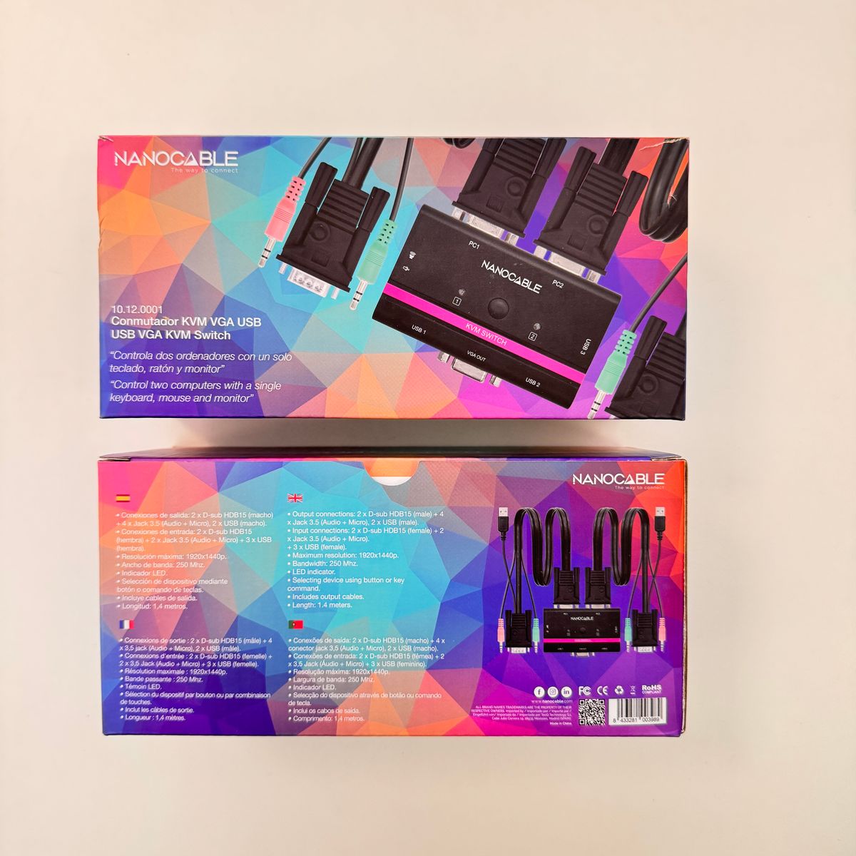 - Aquest KVM switch és un dispositiu que pot controlar dos ordinadors amb un sol teclat, ratolí, monitor i altaveus. inclosos: 2xVGA, 2xJack 3.5(auriculars), 2xJack 3.5(micròfon), 2xUSB- Resolució màxima:1920x1440, ample de banda: 250 Mhz- Indicador LED per a comprovació d'estat- Selecció de PC mitjançant botó o ordre de tecla, 2 ordinadors (PC o ordinador portàtil) amb port USB 1.1 o 2.0 lliure Nanocable KVM SWITCH VGA USB 1U-2PC+CABLE, 1920 x 1440 Pixels, Muntatge en rack, 1U, Negre