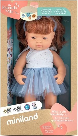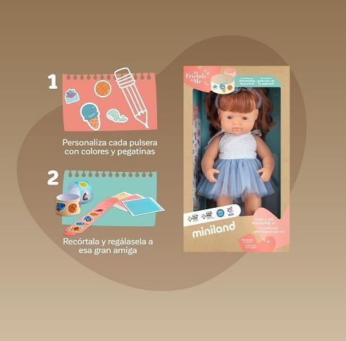 Aquesta nina forma part de la nova col·lecció de nines i ninots de Miniland My Friends & Me, que promou el valor d'amistat i la màgia de compartir amb altres nens, des de petits. Al costat del canell s'inclou una proposta “art&craft” a partir de polseres de l'amistat retallables i personalitzables amb stickers, així com targetes de l'amistat per regalar als seus millors amics/amigues, per tal d'ampliar l'experiència de joc. Cada nina i ninot d'aquesta col·lecció, a més, promou la diversitat i la tolerància, cosa que en fa una eina educativa fantàstica. Està fabricada per Miniland de manera artesanal a Espanya, a partir de vinil suau d'alta qualitat i una lleugera aroma de vainilla. Tant el canell com els accessoris per a les manualitats compleixen amb la normativa de seguretat de la joguina, i són aptes per al joc lliure entre nens a partir de 10 mesos o 3 anys en el cas d'altres models de la col·lecció que incorporen ulleres o implant coclear. Àmplia l'experiència de joc amb els recursos educatius gratuïts que trobaràs a Miniland Teach&Play.