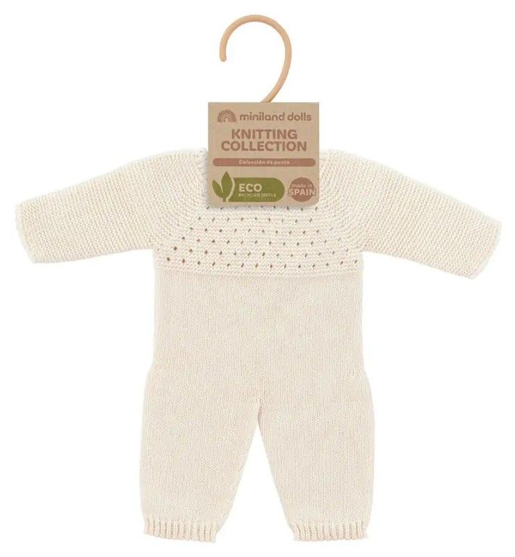 Pijama de punt per a ninots i nines de 21cm. Té un bonic color lli suau. La nova col·lecció de robeta de punt per a ninots Miniland Dolls, està fabricada amb materials reciclats. Tots ells en tonalitats naturals i amb un aire “handmade”.