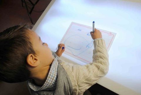 Aquesta pissarra individual, de neteja en sec, té una superfície brillant amb línies pautades en vermell i blau, ideal per a nens que comencen a escriure a escoles de primària. Realitzada en plàstic flexible.