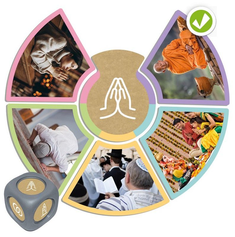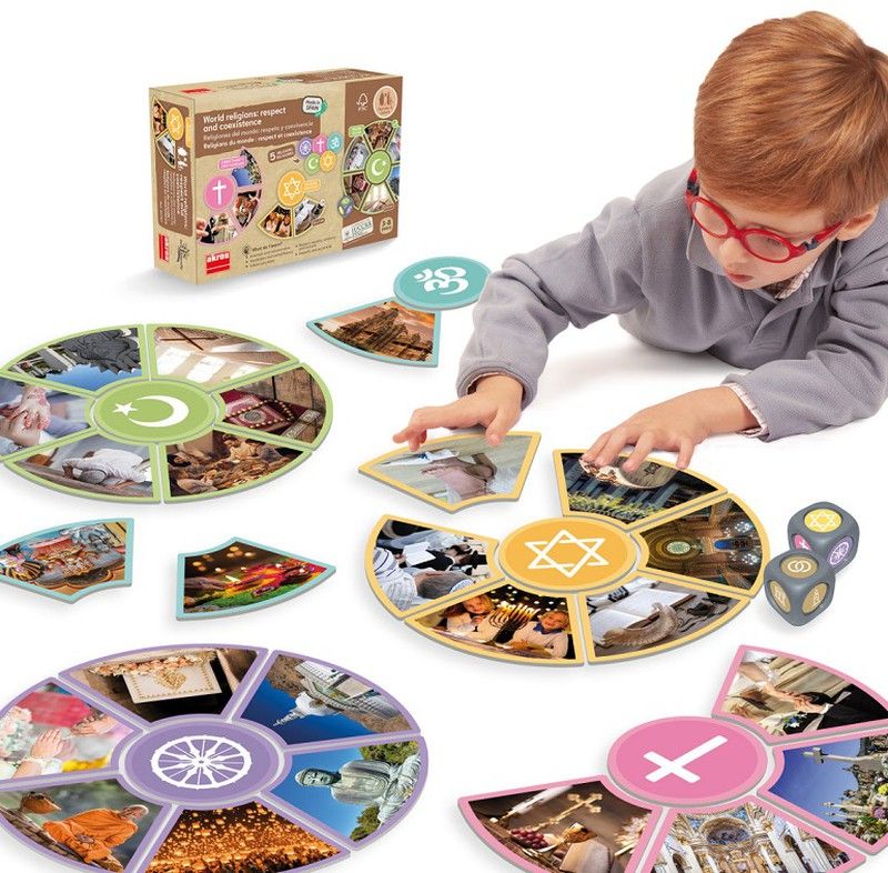 Joc d´associació amb fotografies per descobrir i conèixer diferents religions. Ofereix l'oportunitat de desenvolupar una educació en valors com a base per a la resolució de conflictes. Permet promoure una cultura de pau i respecte des d'edats molt primerenques. En el joc es mostren les religions següents: budisme, cristianisme, hinduisme, islam i judaisme. Llança el dau i descobreix-les!