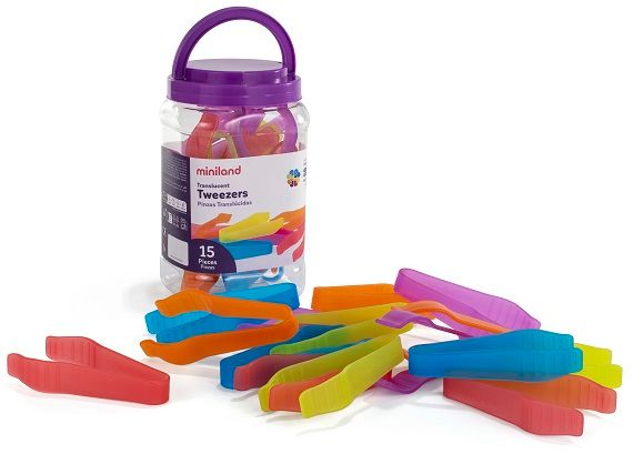 Set de 15 pinces de colors translúcides. A través d'aquest recurs, ideat per treballar la motricitat fina, es treballa molt bé l'acció de pinçat tan important en l'aprenentatge de l'escriptura. Les peces estan fabricades amb plàstic molt resistent.