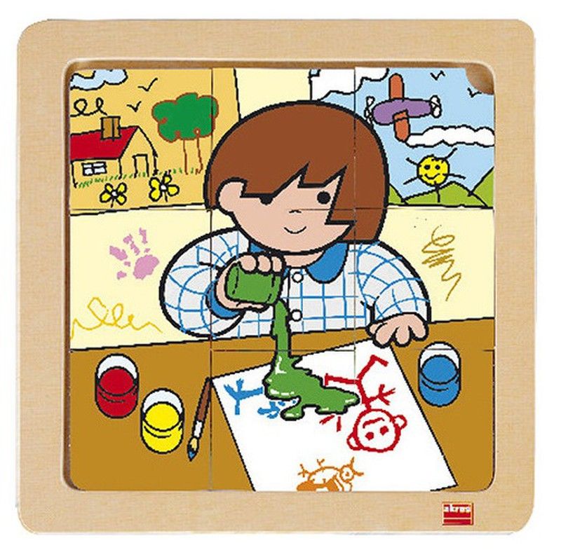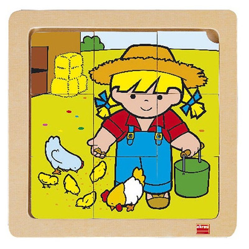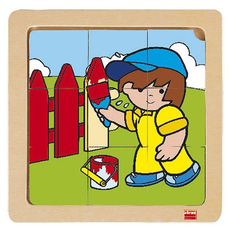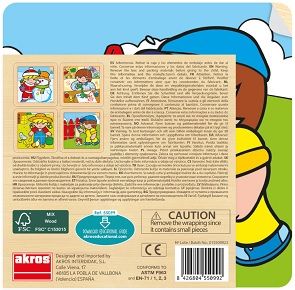441 / 5.000 Un joc de 4 trencaclosques de fusta amb nou peces cadascun. Al trencaclosques, Zaro i Nita, els dos personatges, realitzen diferents accions: Nita a la neu a la granja Zaro pintant Zaro a l'escola