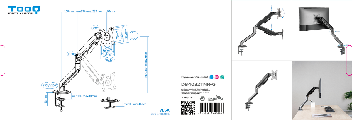 Més informacióCapacitat màxima de pes:9 kg|Mida mínima de pantalla:43,2 cm (17")|Nombre de pantalles suportades:1|Capacitat màxima de pes (per display):9 kg|Mida màxima de pantalla:81,3 cm (32")|Muntatge:Abraçadora/Corpatge|Tipus de muntatge|Tipus de muntatge| (min):75 x 75 mm|Compatibilitat amb interfície de muntatge (màx):100 x 100 mm|Interfície de panell de muntatge:75 x 75,100 x 100 mm|Braç amb capacitat d'extensió (màx.):51,6 cm|Messor de l'escriptori (min):1 cm|Espessor altura:Si|Tipus d'ajust d'alçada:Resort de gas|Rang d'ajustos d'alçada:133 - 428 mm|Ajust de la inclinació:Si|Angle d'inclinació:-55 - 55°|Angle de gir (abast):-90 - 90°|Angle de ro deriva:180°|Gestió de cables:Si|Color del producte:Negre|Pes:2,2 kg|Quantitat per paquet:1 peça(s)|Amplada del paquet:435 mm|Profunditat del paquet:95 mm|Alçada del paquet:155 mm|Pes del paquet:2,74 kg|Tipus de embalatge: usuari:Si