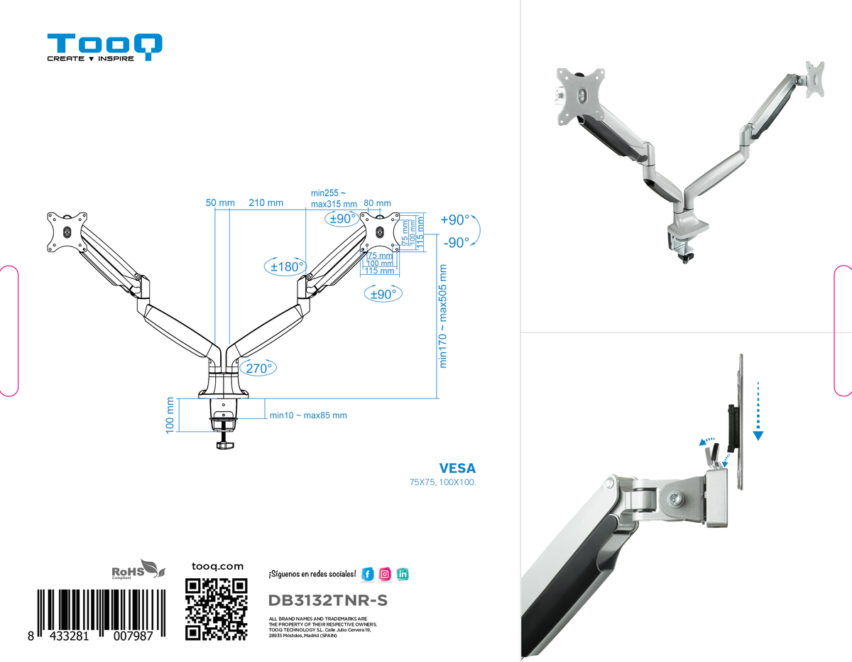 - Suport de taula orientable per a 2 pantalles (monitor/plasma/LCD/LED) d'entre 13" a 32" (depèn de la instal·lació i de l'espai disponible) amb 3 punts de gir- Permet instal·lació a la taula, a través d'abraçadora oa través del cargol passant.- Compleix els estàndards de VESA 70- 9kg per braç- Angle d'inclinació: -90o i +90o- Angle màxim de gir: 360o (depèn de la mida de la pantalla, de la instal·lació i de l'espai disponible)- Angle màxim de rotació: 180o- Braç articulat amb pistó de gas- Material: Alumini- Color 2 Pantalles (Monitor / TV Plasma / LCD / LED) 13” – 32”, de Dos Braços, Plata, Abraçadora/Cargolat, 18 kg, 33 cm (13"), 81,3 cm (32"), 100 x 100 mm, Plata