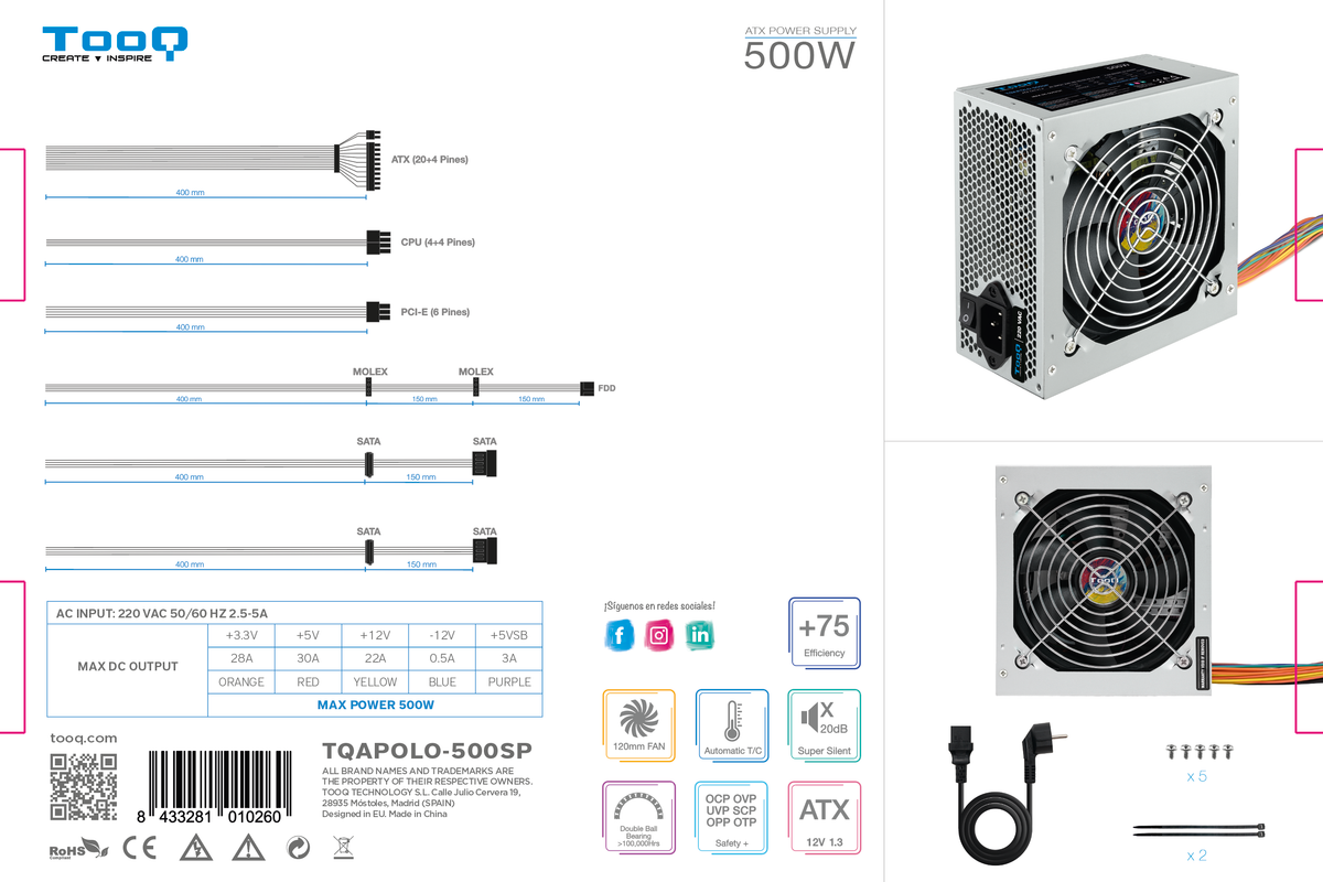 Més informacióPotència total: 500 W | Voltatge d'entrada AC: 220 V | Freqüència d'entrada AC: 50 - 60 Hz | Corrent d'entrada: 2.5 - 5 A| (+5V):30 A|Corrient màxima de sortida (-12V):0,5 A|Corrent màxima de sortida (+5Vsb):3 A|Funcions de protecció de poder:Sobreintensitat, Sobretensió, Sobrevoltatge, Sobreescalfament, Curtcircuit, Baix voltatge|Alimentador d'energia per a targeta mare:20+ base:40 cm|Nombre de connectors d'energia SATA:4|Longitud del cable d'alimentació SATA:400,550 mm|Connectors de poder (4 pin) periferals (Molex):2|Longitud del cable d'alimentació perifèric (Molex):400,550 mm|Si Connector d'alimentació EPS pin):1|Longitud del cable d'alimentació PCI Express:40 cm|CPU connector d'alimentació (4 +4 pins):Si|Longitud del cable d'alimentació CPU:40 cm|Connector de poder floppy:1|Connector a unitat de disquets:Si|Longitud del cable de la unitat de disquet:70 cm| modular|Certificació 80 PLUS:No|Utilitzar amb:PC|Factor de forma de font d'alimentació (PSU):ATX|Versió ATX:1.3|Color del producte:Plata|Tipus de refredament:Actiu|Diàmetre de ventilador:12 cm|Número de ventiladors:1 Ventilador(ca)| encès/apagat integrat:Si|Cables inclosos:Corrent alterna|Amplada:150 mm|Profunditat:140 mm|Alçada:85 mm|Manual d'usuari:Si|Amplada del paquet:228 mm|Profunditat del paquet:159 mm|Alçada del paquet:100 mm|Tipus d'embalatge:Ca cargols:5|Inclou brides:Si