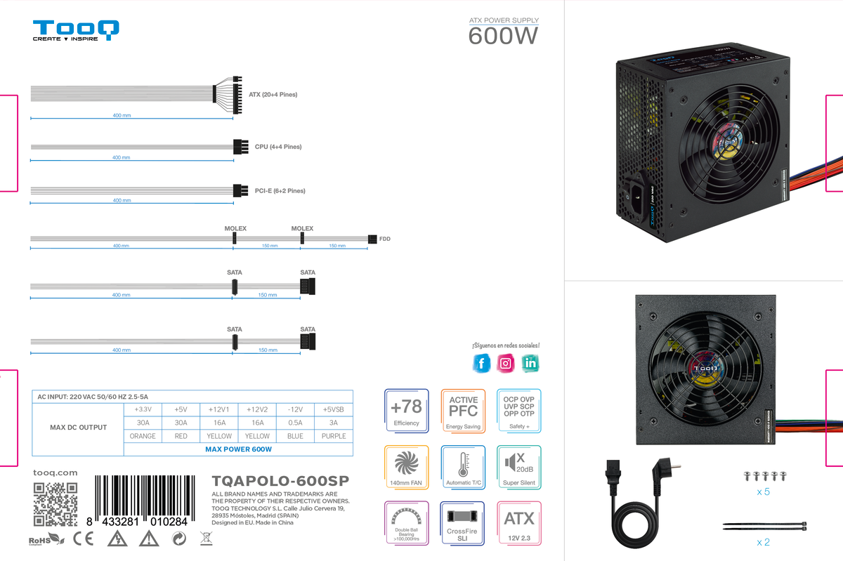 Més informacióPotència total: 600 W|Voltatge d'entrada AC: 220 V| V1):16 A|Corrient màxima de sortida (+12 V2):16 A|Corrient màxima de sortida (+5V):30 A|Corrient màxima de sortida (-12V):0,5 A|Eficiència:78%|Funcions de protecció de poder:Sobreintensitat, Sobrevoltatge, Sobrecàrrega, Curtcircuit+ pin ATX|Longitud del cable d'alimentació de la placa base:40 cm|Nombre de connectors d'energia SATA:5|Longitud del cable d'alimentació SATA:700 mm|Connectors de poder (4 pin) periferals (Molex):3|Longitud del cable d'alimentació perifèric (Molex)2 pin):1|Longitud del cable d'alimentació PCI Express:40 cm|CPU connector d'alimentació (4 +4 pins):Si|Longitud del cable d'alimentació CPU:40 cm|Connector de poder ATX (20 + 4 pin):Si|Connector de poder floppy:1|Connector a unitat de disquets:Si|Long de cablejat:No modular|Certificació 80 PLUS:No|Formes de factor de targeta mare suportades:ATX|Utilitzar amb:PC|Factor de forma de font d'alimentació (PSU):ATX|Versió ATX:2.3|Color del producte:Negre|Tipus de refredament:Actiu|Diàmetre de ventilador:14 cm de ventilador:Superior|Interruptor d'encès/apagat integrat:Si|Cables inclosos:Corrent alterna|Certificats de conformitat:CE, RoHS|Seguretat:OCP, OVP, UVP, SCP, OPP, OTP|Amplada:150 mm|Profunditat:160 mm|Alçària:85 mm|2 mm|Alçada del paquet:102 mm|Tipus d'embalatge:Caixa